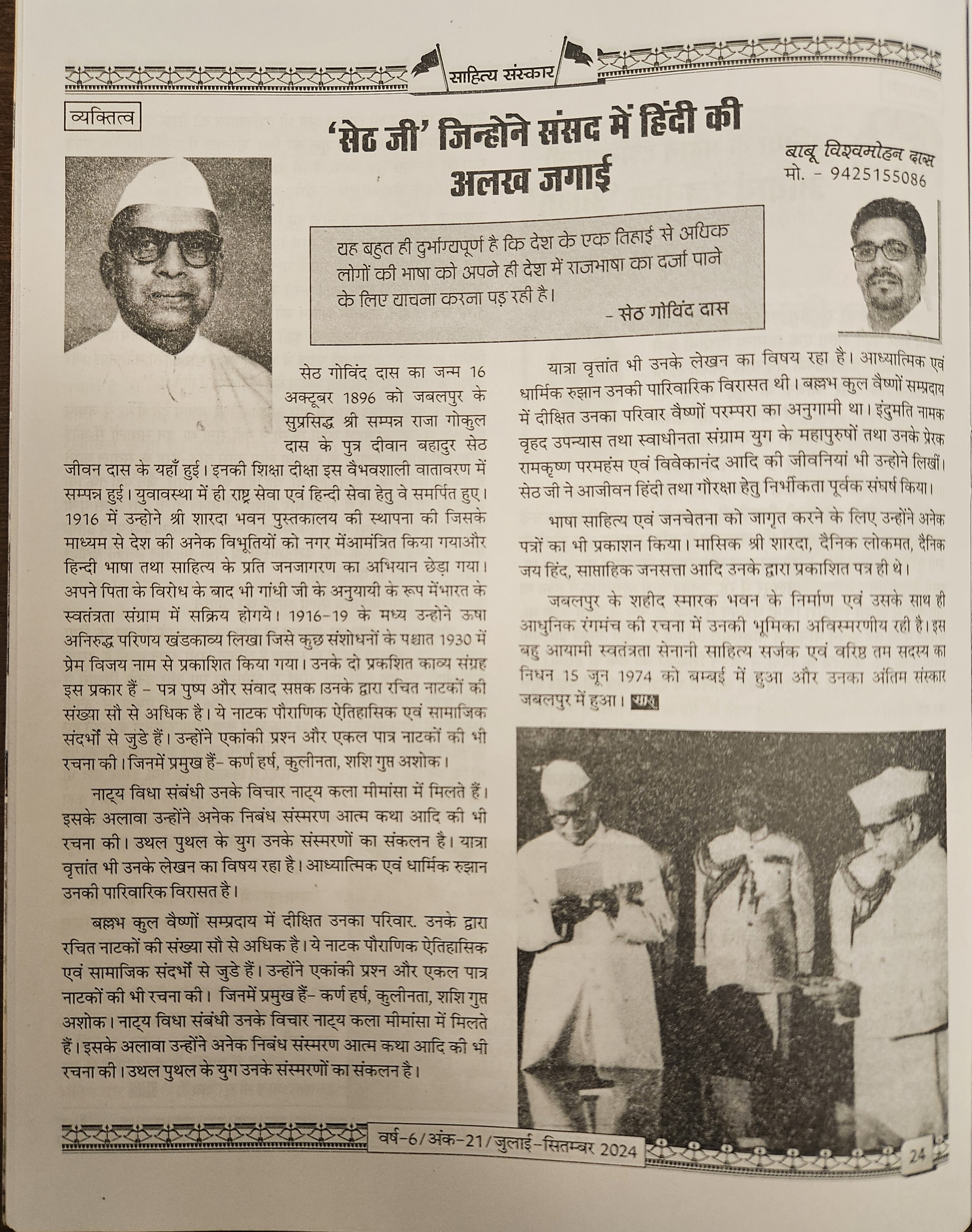 | 1 | Akhsar Shilpi | Seth Govinddas | July-September 2014 | Download PDF(6.23Mb) |